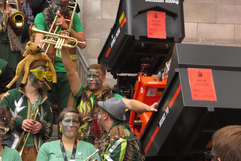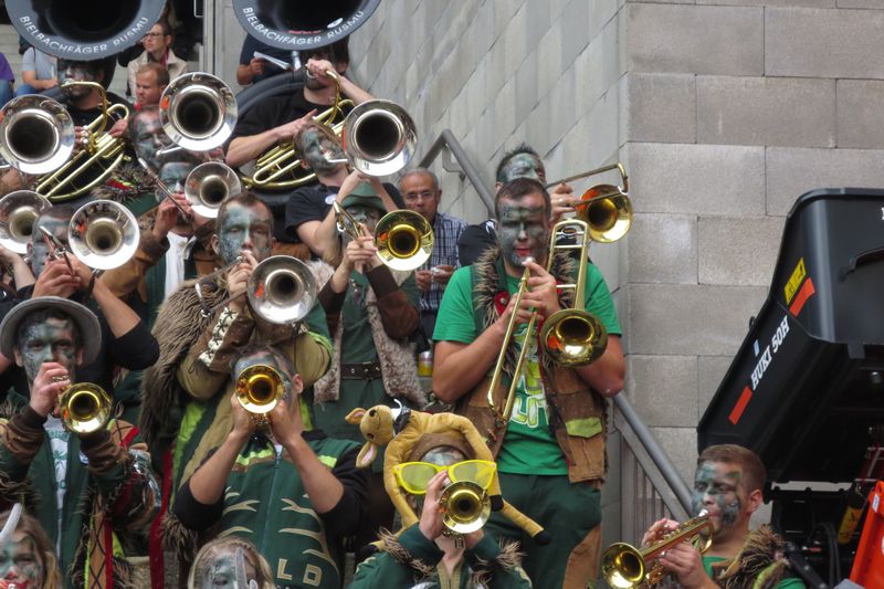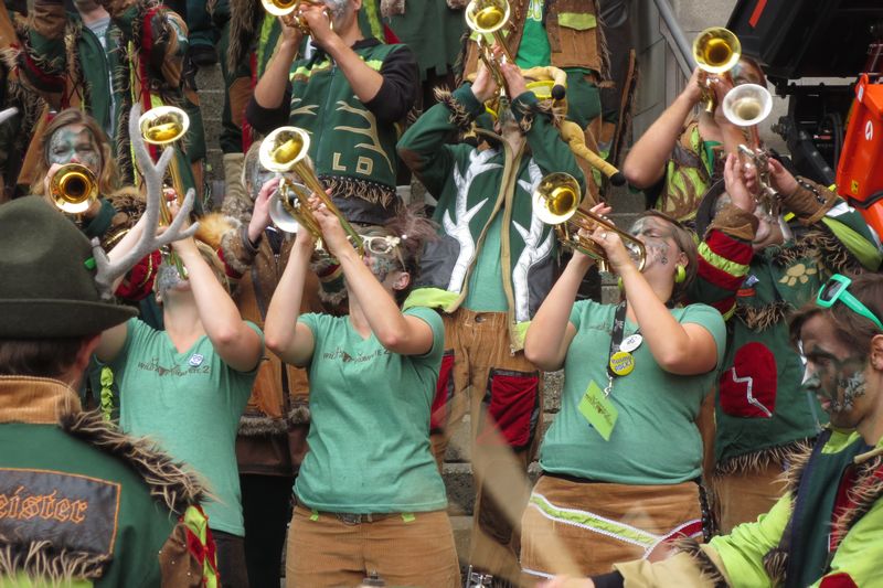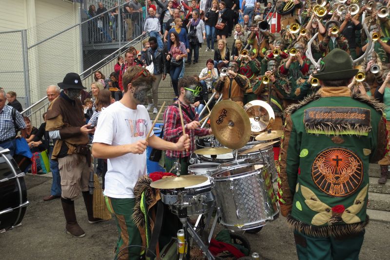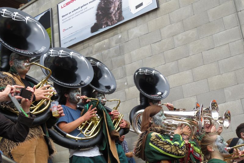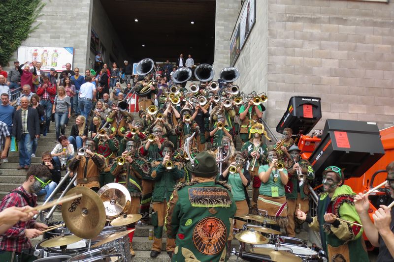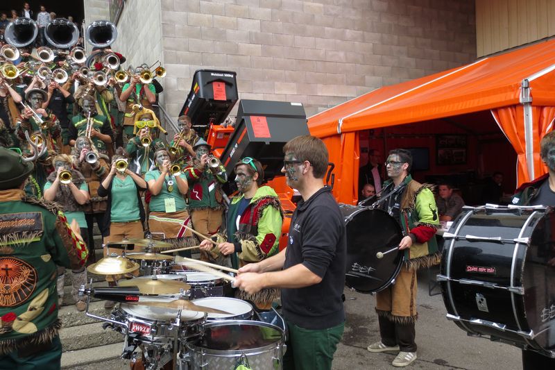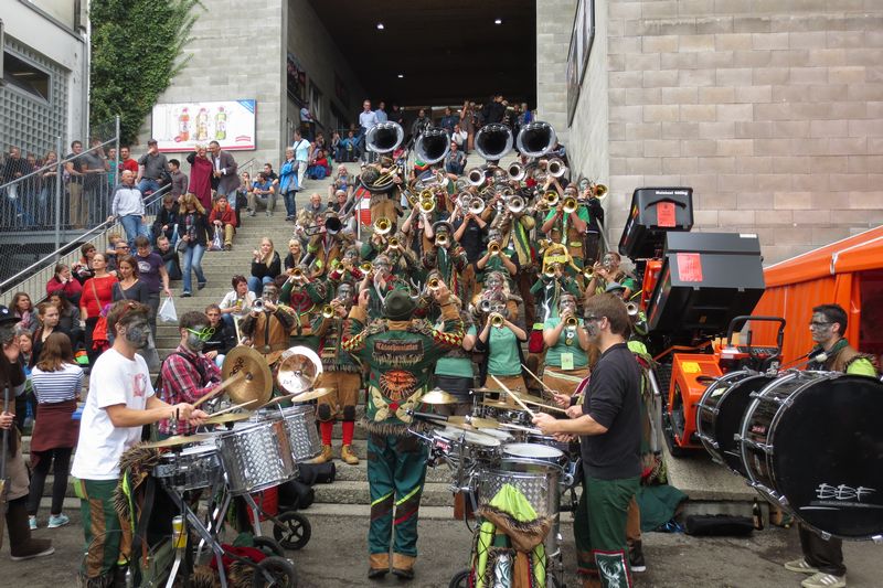Die im Car gesparte Energie brauchten wir dann am Umzug. Vor einer einmaligen Kulisse gaben wir rund eine Stunde lang alles, um die vielen tausenden Leute am Strassenrand mitzureissen. Wir ernteten dabei sehr viel Anerkennung und Beifall. Die St. Galler scheinen ein fasnachtsverrücktes Volk zu sein. Kurz gesagt: sie waren wild auf uns!