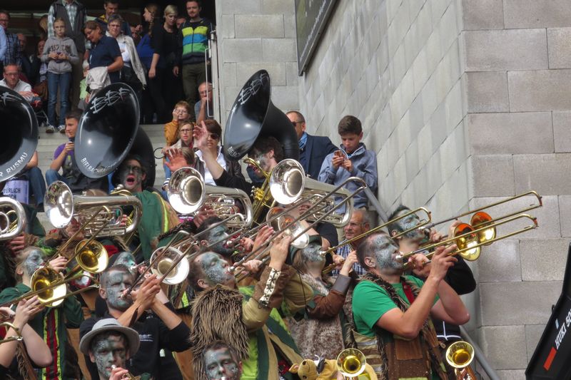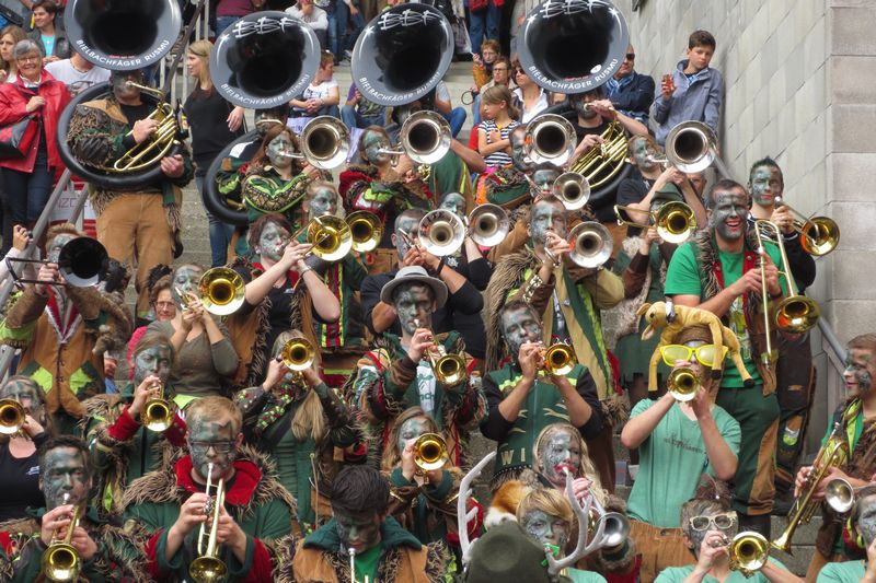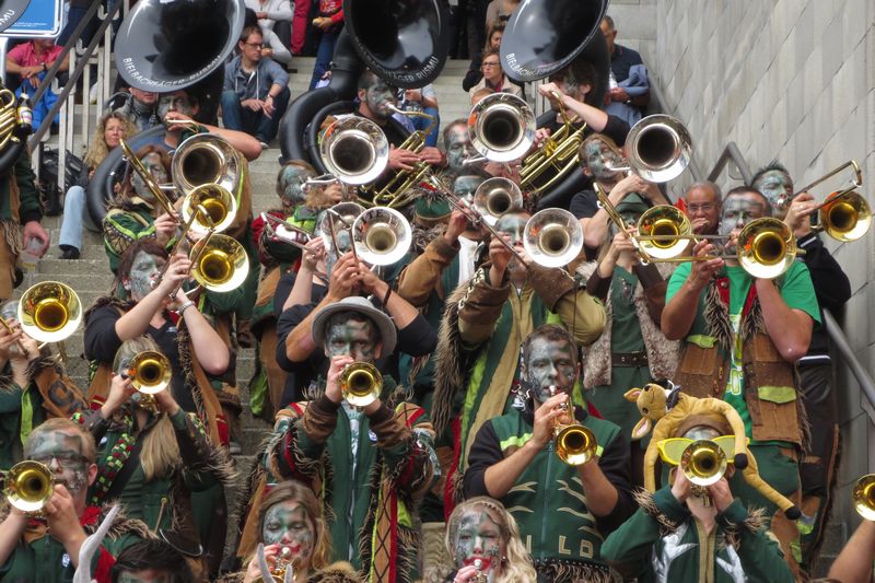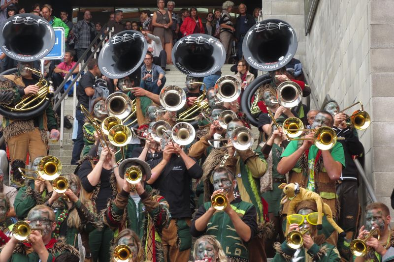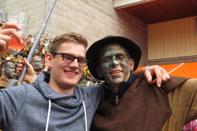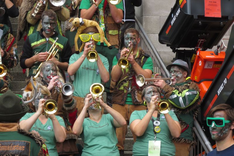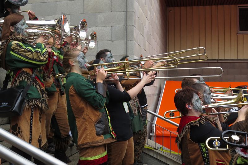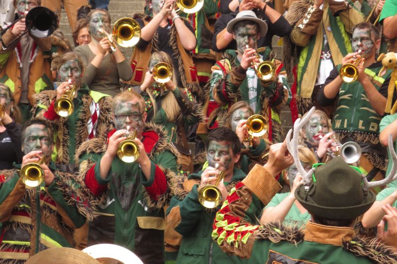 Die im Car gesparte Energie brauchten wir dann am Umzug. Vor einer einmaligen Kulisse gaben wir rund eine Stunde lang alles, um die vielen tausenden Leute am Strassenrand mitzureissen. Wir ernteten dabei sehr viel Anerkennung und Beifall. Die St. Galler scheinen ein fasnachtsverrücktes Volk zu sein. Kurz gesagt: sie waren wild auf uns!