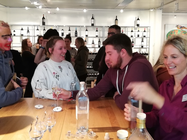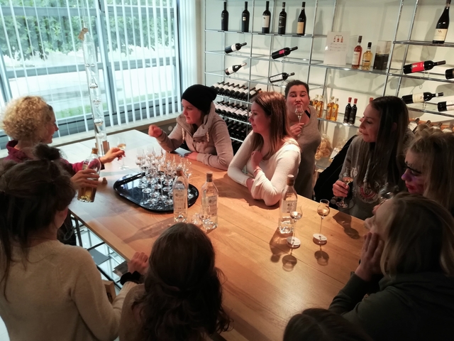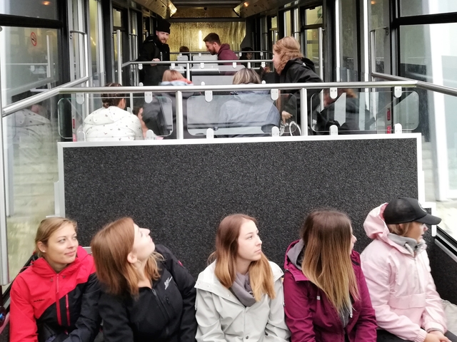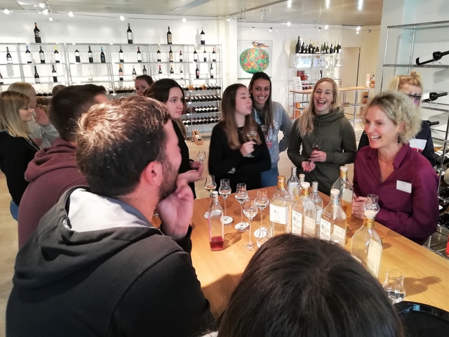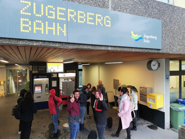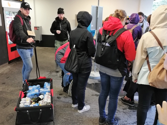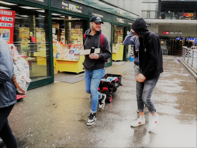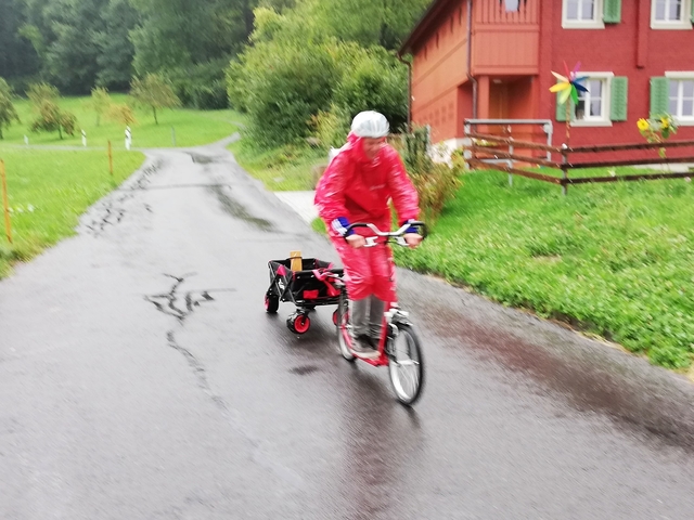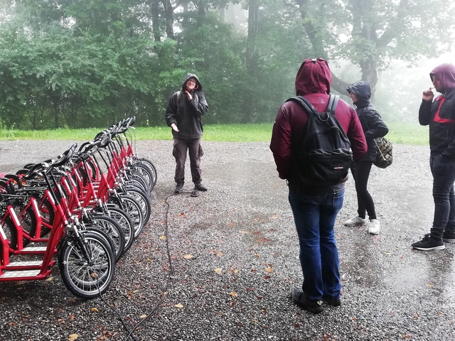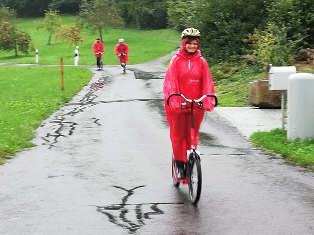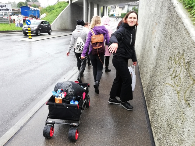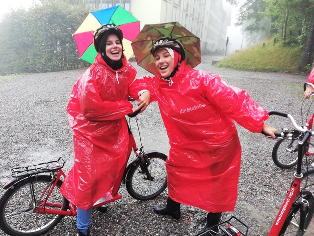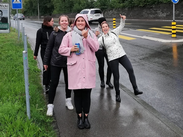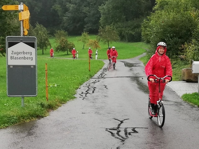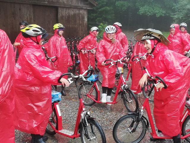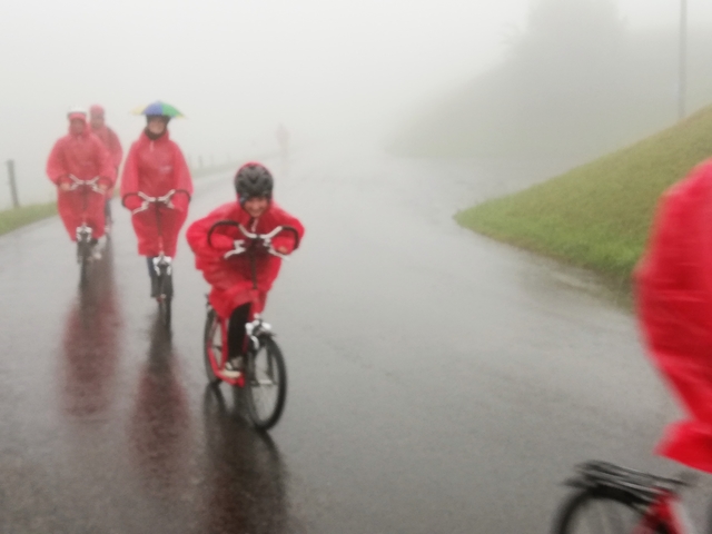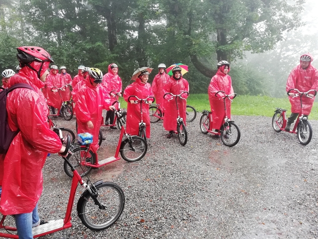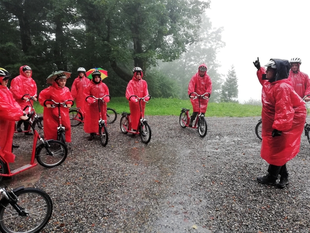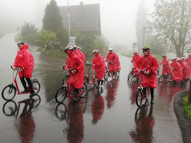 Mit Bus, Zug und Zahnradbahn ging es nach Zug auf den Zugerberg. Dort angekommen, wurden Helme und Trotti gefasst und eine kurze Instruktion konsumiert. Zudem packten wir uns in rote Regenmäntel ein, da es ziemlich fest geschifft hat. Wir düsten ratzfatz den Berg runter direkt zur Etter Distillerie, wo wir eine spannende Führung erleben und einige Säfte ausprobieren durften.