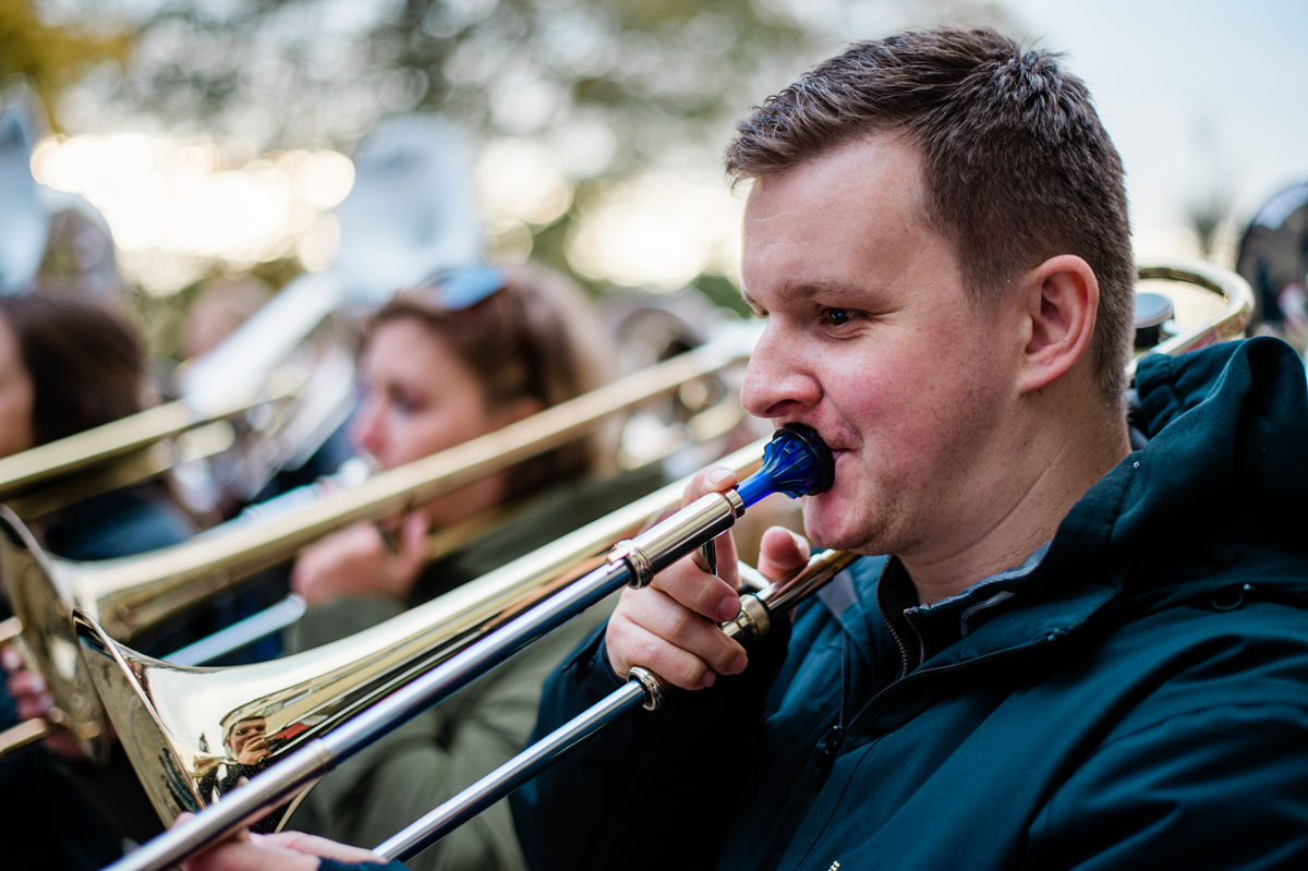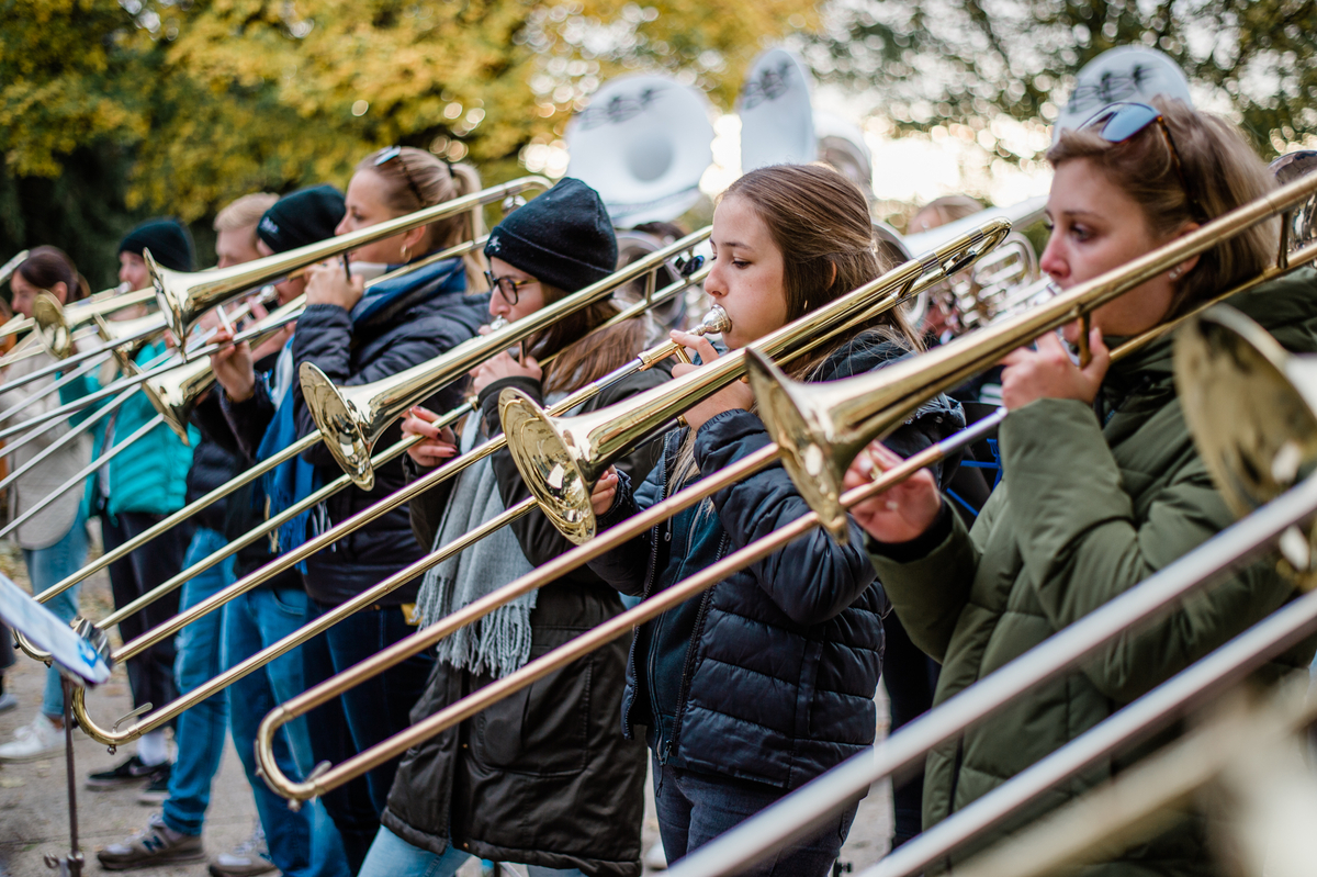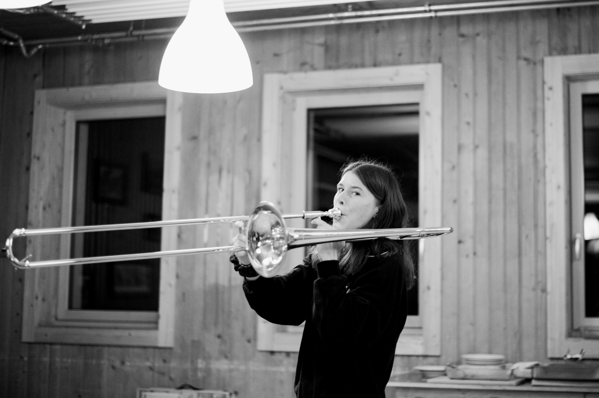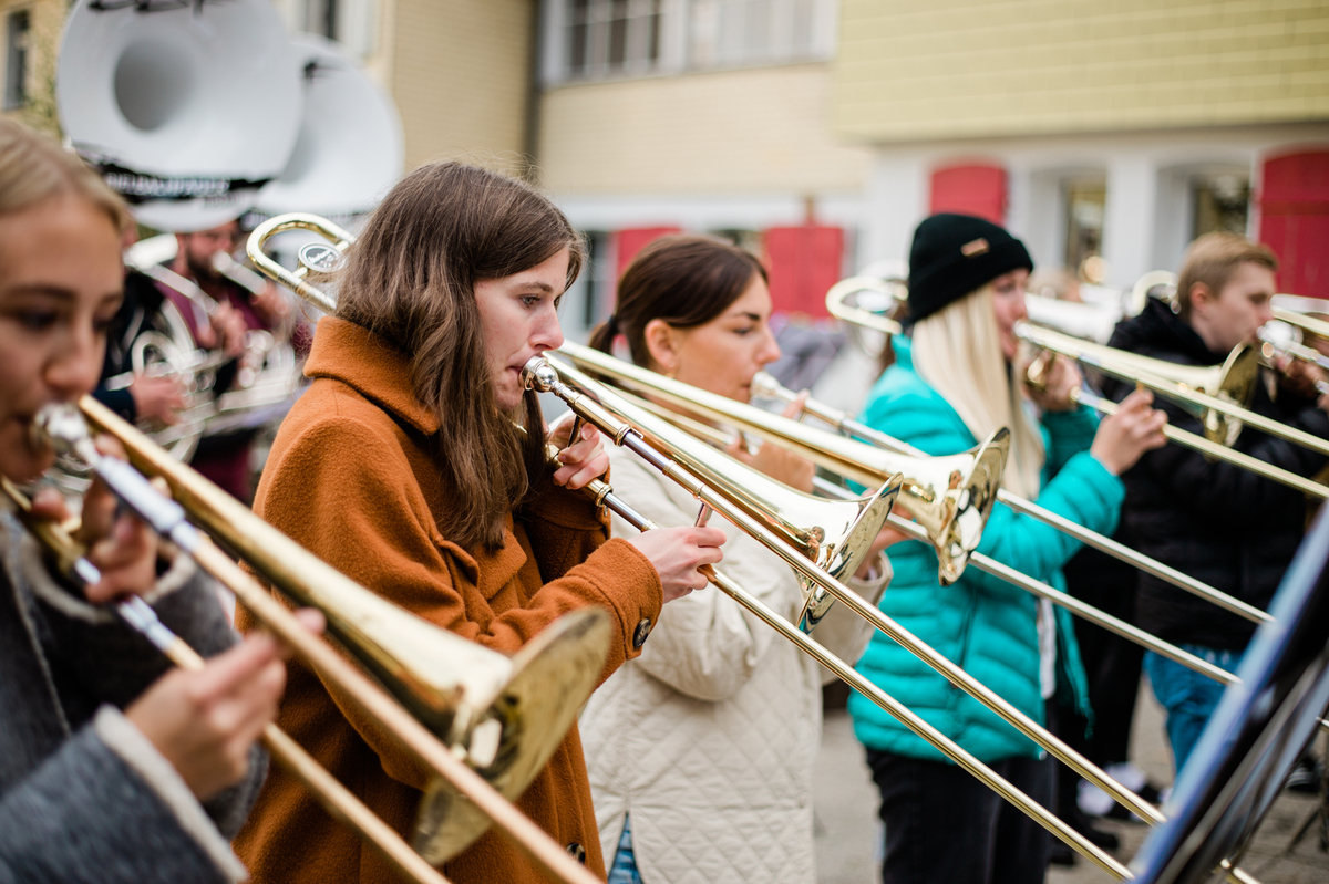 Ein konzentriertes Posaunenregister beim "Ineloh" an der Gesamtprobe. Foto: Roger Dula